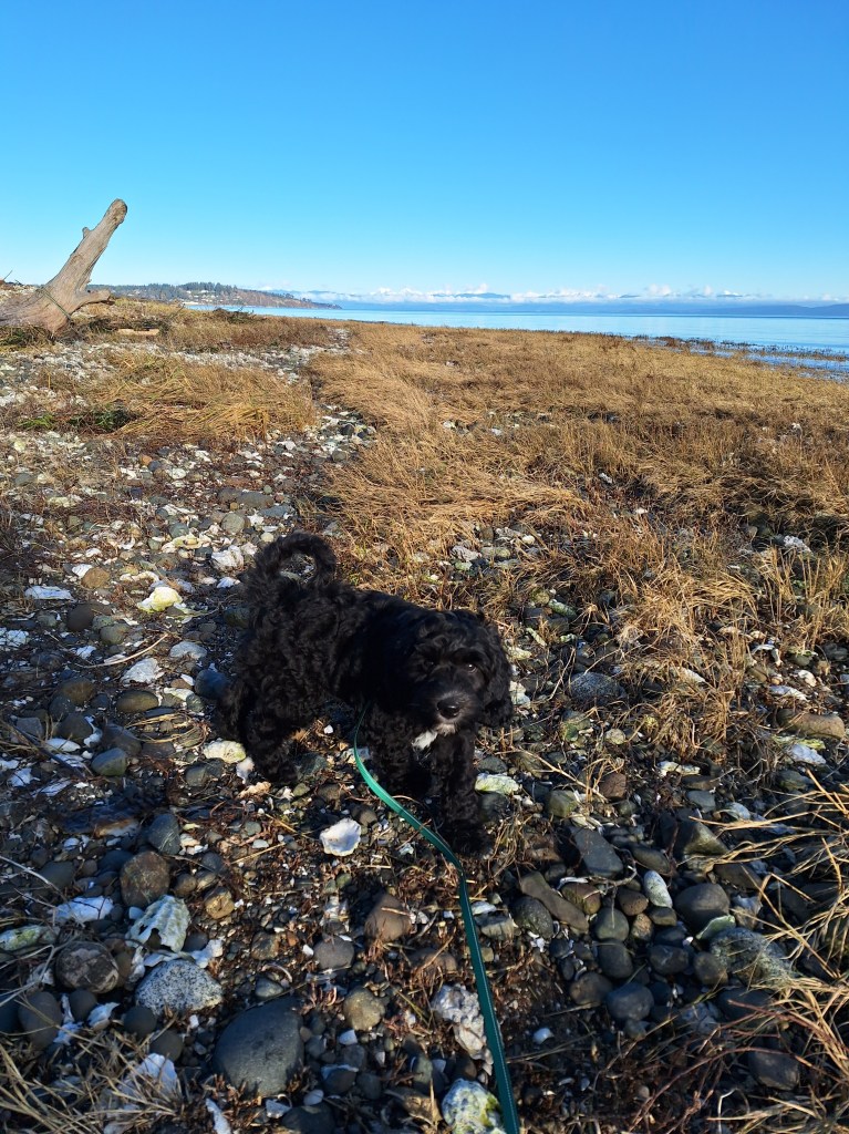At the beach and at Rosewall Creek…I wouldn’t let him play with a salmon carcass- how mean!
